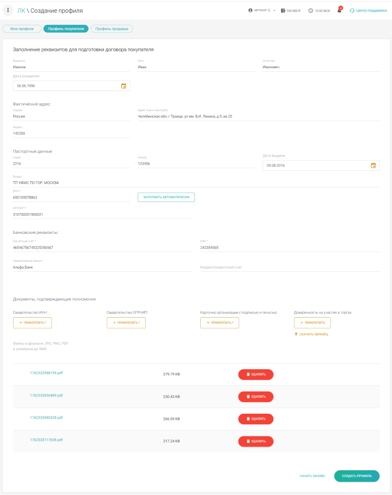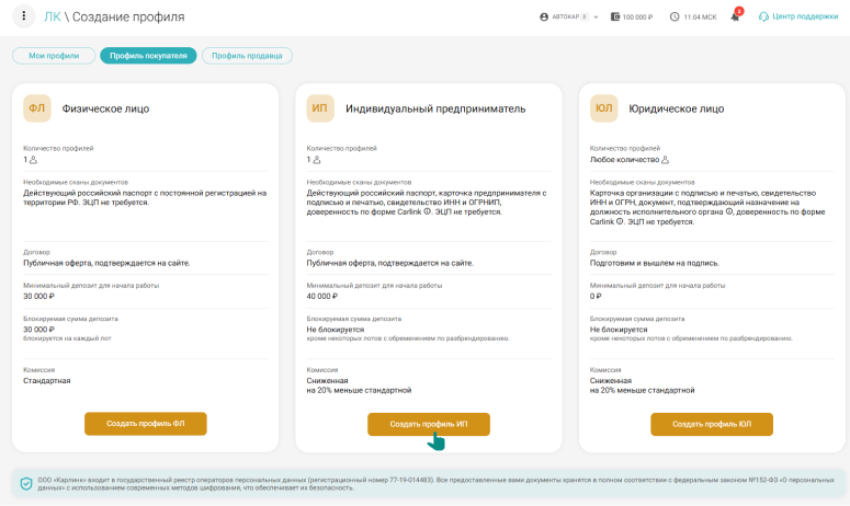 Для того чтобы перейти к заполнению формы создания профиля, необходимо нажать на «создать профиль» в навигационной панели или на виджете «Данные аккаунта» в Личном кабинете (перейти в личный кабинет можно по клику на имя пользователя в главном меню) (рис.). Далее на открывшейся странице ЛК\Профили на форме «Создать новый профиль» необходимо нажать на кнопку «Профиль покупателя» (рис.). Кроме этого на данной форме можно ознакомиться с образцами договоров. После этого, на странице ЛК\Создание профиля (рис.) можно ознакомиться с остальными условиями участия для ФЛ, ИП и ЮЛ, – выбрать нужную вам форму, нажав на кнопку «Создать профиль ИП» и заполнить форму для подготовки договора Покупателя.