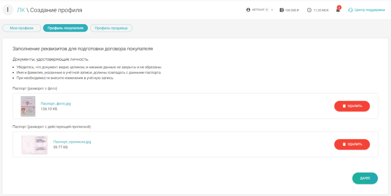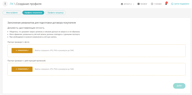 После того как вы прикрепили документ, удостоверяющий личность – запустится процесс распознавания данных. В случае успешного завершения процесса отобразится форма с заполненной информацией для создания профиля покупателя. Необходимо внимательно ознакомиться и проверить данные на корректность и при необходимости отредактировать.