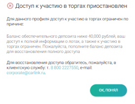 Для получения полного доступа к информации по лотам и участию в торгах необходимо создать профиль физического лица, подписать Публичную оферту о заключении договора на оказание услуг по организации доступа к торговой площадке Carlink, созданной на базе интернет-сайта carlink.ru, а также внести обеспечительный депозит.